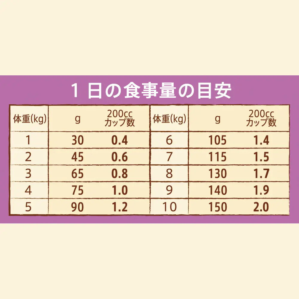 内容量800g原材料乾燥鹿肉、玄米、オートミール、粗挽き米、ヒヨコマメ、米糠、エンドウタンパク、エンドウマメ、鶏脂※、タンパク加水分解物、亜麻仁、ひまわり油※、大豆油※、ビタミン類(A、B1、B2、B6、B12、D3、E、コリン、ナイアシン、パントテン酸、ビオチン、葉酸)、ミネラル類(カリウム、クロライド、セレン、ナトリウム、マンガン、ヨウ素、亜鉛、鉄、銅)、アミノ酸類(タウリン、メチオニン)、酸化防止剤(ミックストコフェロール、ローズマリー抽出物)、緑茶抽出物、スペアミント抽出物 (※ミックストコフェロールで保存)保証成分タンパク質:22.0%以上、脂質:14.0%以上、粗繊維:3.5%以下、灰分:10.0%以下、水分:10.0%以下、リノール酸:3.5%以上、亜鉛:250mg/kg以上、ナイアシン:250mg/kg以上、ビオチン:2.5mg/kg以上カロリー約380kcal/100g生産国アメリカ与え方 【1日の給与量の目安】 体重(kg)g200ccカップ数 体重(kg)g200ccカップ数 1300.361001.32450.671101.43600.881201.64751.091351.75851.1101451.9 ●上記給与量の目安は成犬用です。