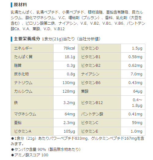 乳清たんぱく、乳清ペプチド、小麦ペプチド、植物油脂、亜鉛含有酵母、貝カルシウム、酸化マグネシウム、V.C、増粘剤(プルラン)、香料、乳化剤(大豆を含む)、ピロリン酸第二鉄、ナイアシン、V.E、V.B2、V.B1、V.B6、パントテン酸Ca、V.A、葉酸、V.D、V.B12 ★
