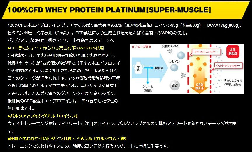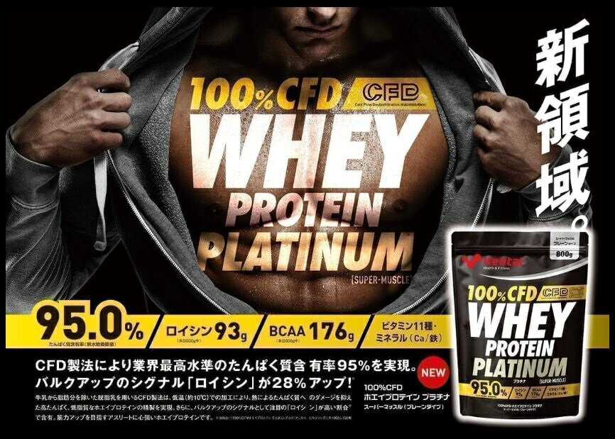 Kenai(ケンタイ)ホエイプロテイン プラチナ スーパーマッスル プレーンタイプ 800g 100%CFD製法 【 特徴 】 ・CFD製法によって作られる高含有率のWPI(Whey Protein Isolate)のみ使用 ・たんぱく質含有率 95.0%(無水物換算値) ・ロイシン 93g(製品 800g当たり) ・BCAA 176g(製品 800g当たり) ・ビタミン11種・ミネラル(Ca・鉄)配合 ・内容量:800g ■お召し上がり方■ 1回 約25g(目安:スプーンすりきり3杯半)を、200ccの牛乳や水に溶かしてお召し上がりください。