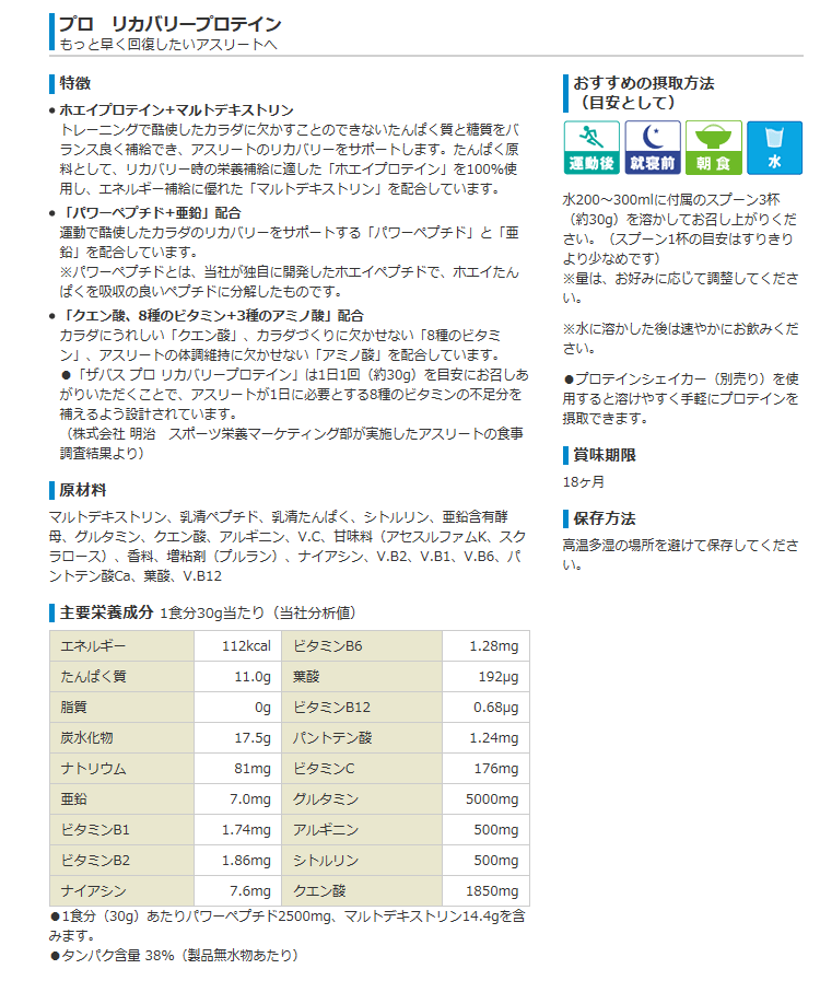(「ザバス プロ リカバリープロテイン」は1日1回(約30g)を目安にお召しあがりいただくことで、 アスリートが1日に必要とする8種のビタミンの不足分を補えるよう設計されています)メーカー希望小売価格はメーカーサイトに基づいて掲載しています